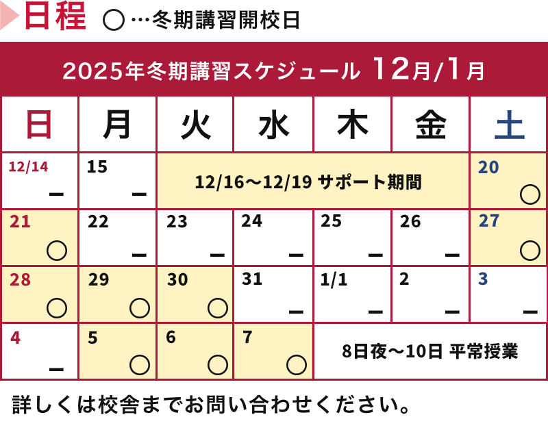 冬期講習ではご都合のよい日時を選べます。 詳しい日程は各校舎にお問い合わせください。